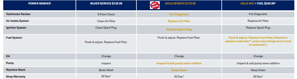 A pre-paid labor deposit charge of $60 is required for all services. This $60 will apply to your final bill or be used as a diagnostic fee if you choose not to complete the repairs. Customers that choose not to repair equipment will get a $25 discount on a new power washer if purchased within 30 days. Fixed-priced maintenance services are for string trimmers of brands we are a dealer for. Other brands may qualify for discounted fixed-rate price at our discretion.